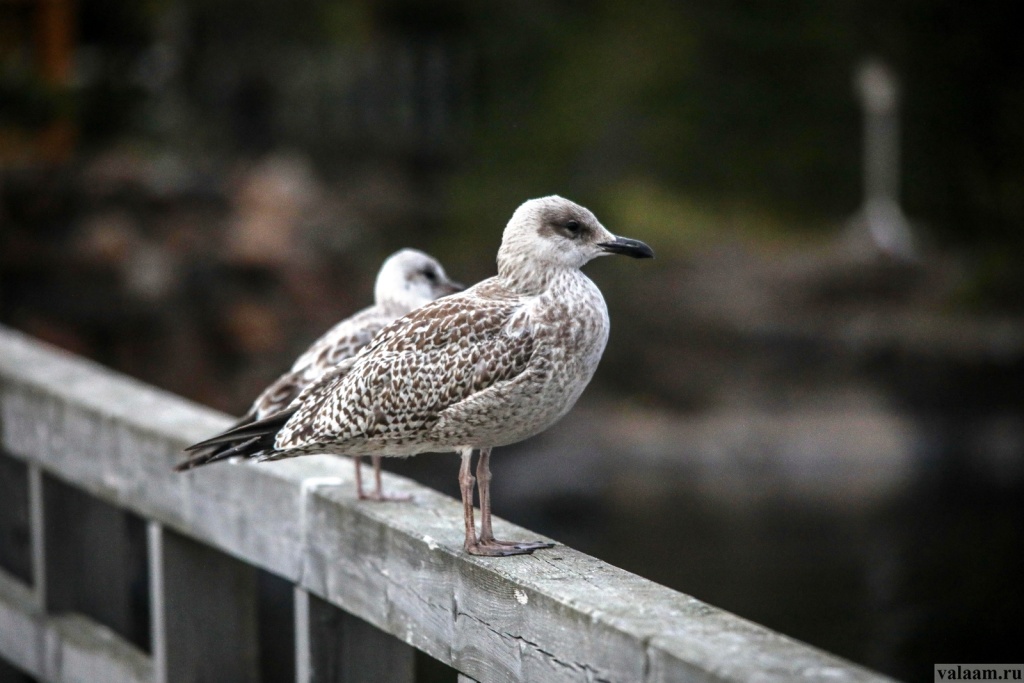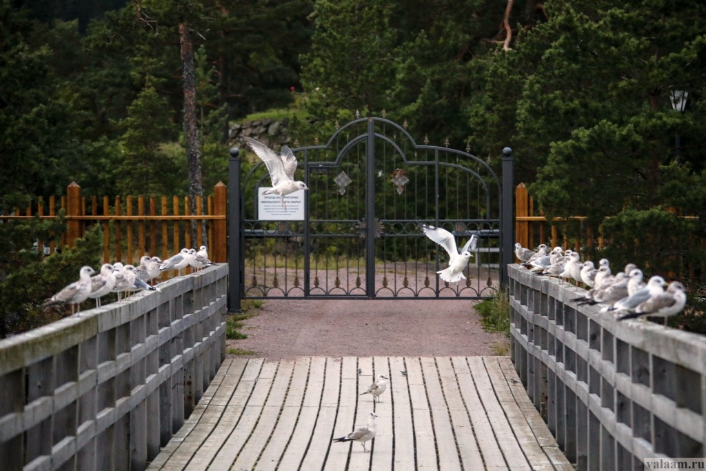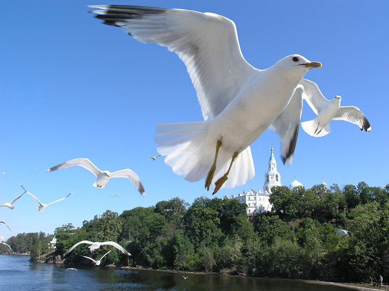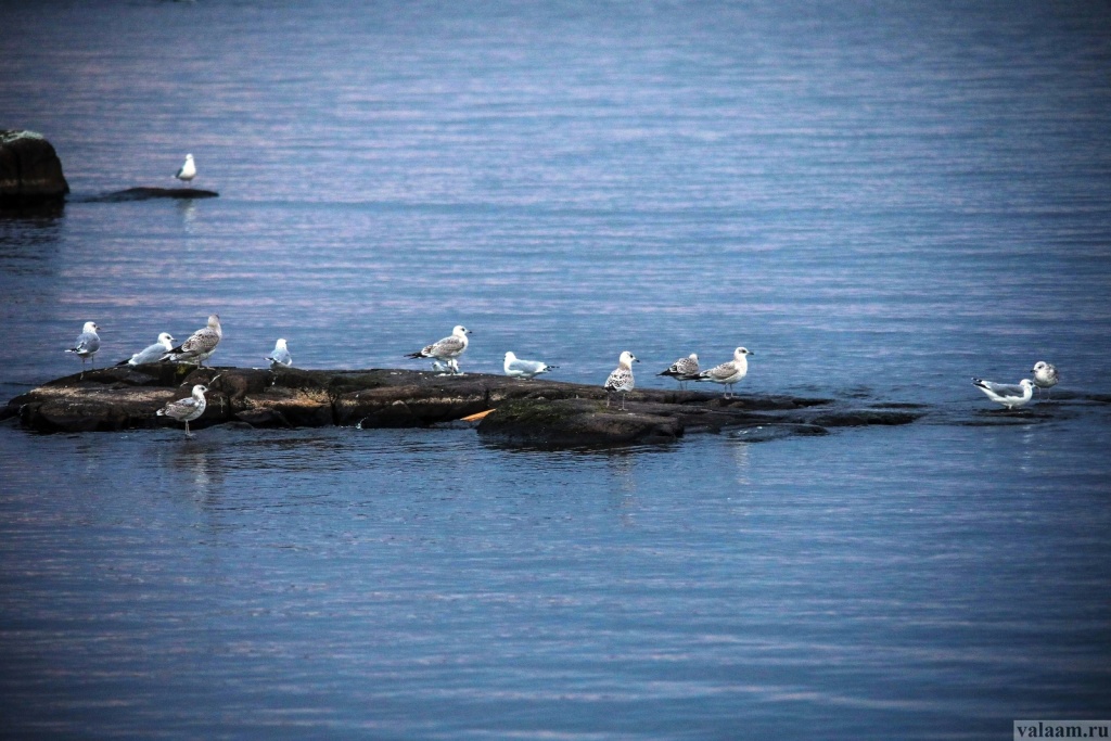 На Валааме чаек очень много. Они собираются большими стаями, обитают на всех островах архипелага, вьются вокруг жилых построек монастыря, сидят на крышах, толпятся вокруг мусорных контейнеров, лишая других птиц их ежедневного пропитания. Еще до приезда на Валаам, оказавшись на причалах Приозерска и Сортавалы, можно обратить внимание на обилие чаек. Они летают, важно похаживают по причалу, плавают на воде, не сильно опасаясь людей, и как только в радиусе их охвата появляется что-то съедобное, слетаются кучей к месту подкорма, что-то громко крича и воюя друг с другом. Если еды мало, то она достанется сильнейшему, не всегда самому крупному «морскому коршуну».