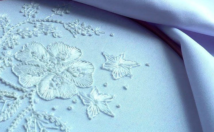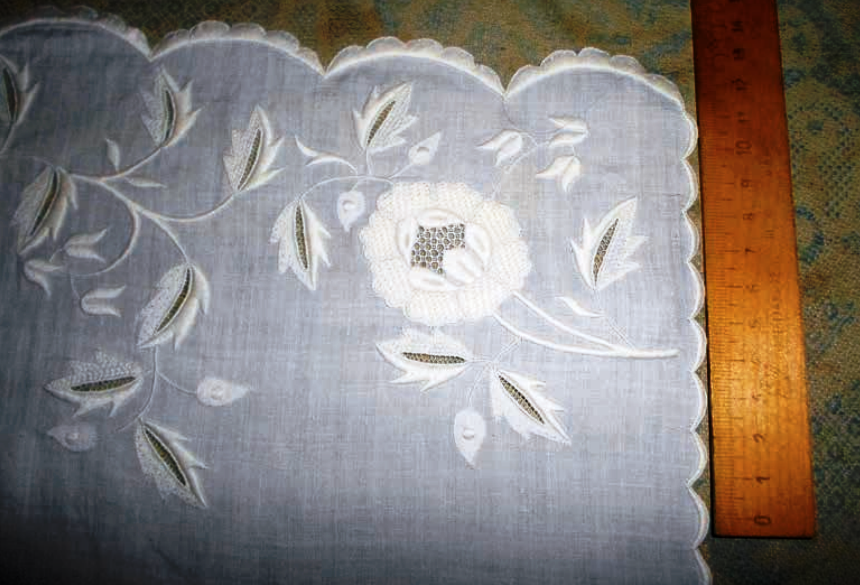 Полотенце вышито по фабричному белому батисту плотной белой гладью, которую исполнила искусная, уверенная рука. У вышивальщицы наверняка были отличное зрение, так как сделать мережки-сетки на полупрозрачной материи трудно, и нежные руки, за которые не цеплялись тоненькие нити. Использованные ею хлопчатобумажные нитки, минимум трех видов, были фабричного производства. Среди гладьевых швов на полотенце соединились швы для мира и для храма. Если атласная гладь и гладь по настилу применима и там, и там, то теневую гладь, мережки и французские узелки можно выполнить только на тонких материях, из которых для церкви ничего не шили. Лепестки цветов вышиты четырьмя сложными гладьевыми кроющими швами, которые используют и в шитье металлической нитью. Именно такими швами вышивали золотые и серебряные цветы на облачениях духовенства, покровах и пеленах. Можно предположить, что молодая женщина на белой вышивке набивала руку для того, чтобы ей доверили шитье золотом. Так как на полотенце есть монограмма, то оно было исполнено на заказ для богатого приданого.