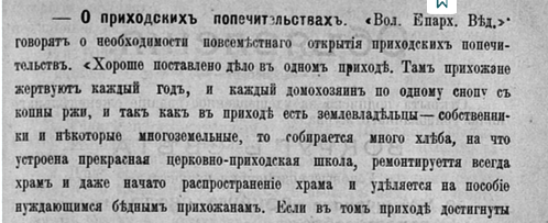 «Волынские епархиальные ведомости» пишут о примере приходского попечительства. Хорошо поставлено дело в одном приходе: там прихожане жертвуют каждый год, каждый домохозяин –по одному снопу с копны ржи. И так как в приходе есть землевладельцы-собственники и некоторые многоземельные, то собирается много хлеба, на что устроена прекрасная церковно-приходская школа, ремонтируется всегда храм и даже начато распространение храма и уделяется на пособие бедным прихожанам».
