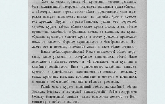 «Как же тяжко грешат те христиане, которые рассеянно, без молитвенного настроения вступают в святые врата обители, а некоторые даже курят здесь табак, пропитываясь сами и заражая воздух зловонием, нимало не разумея, куда и зачем они пришли. Другие, по рассеянности, уходя от церковной службы, курят табак вблизи самого храма Божия, а в летнее время – на кладбище, собравшись иногда в компании, в кучки, превращая преддверие святого храма и место упокоения православных в какое-то сборище курильщиков и безобразников. Делают это и молодые, и пожилые люди, и даже седые старики.