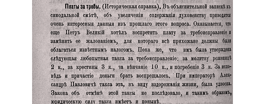 «Плата за требы (историческая справка). В объяснительной записке к синодальной смете об увеличении содержания духовенству приводятся очень интересные данные из прошлого этого вопроса. Оказывается, что еще Петр Великий хотел воспретить плату за требоисправление и заменить ее жалованием, для которого все прихожане должны были облагаться известным налогом. Пока же им была утверждена следующая любопытная такса за требоисправление: за молитву роженице – 32 копеек, за крестины – 3 копейки, за венчание – 10 копеек и погребение – 3 копейки. За исповедь и причастие брать деньги воспрещалось. При императоре Александре Павловиче такса эта, ввиду вздорожания жизни, была удвоена. Закона об отмене этой таксы не последовало, таким образом, юридическую силу сия такса имеет и поныне».