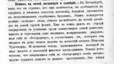 «В Петербурге, как это ни странно, все еще замечается, в особенности в средних и нижних классах населения, большая склонность ко всевозможным суеверным бредням. Этим пользуются разные «дошлые» люди, обман процветает на почве суеверия в самой грубой форме. Еще на этих днях в городе оперировали с успехом среди семей зажиточных торговцев и ремесленников одна женщина, кощунственно выдававшая себя за «богородицу», и сообщник ее, которого она вводила в дома своих жертв в качестве святого Николая Чудотворца. Мошенники теперь разыскиваются полицией ввиду жалоб и заявлений многих пострадавших. Теперь установлено, что выдававшая себя за «богородицу» особа неоднократно судилась за различные преступления».