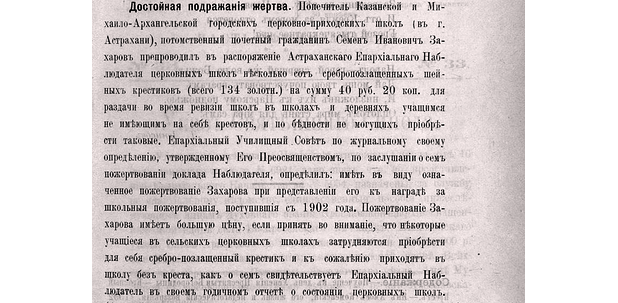 «Попечитель Казанской и Михаило-Архангельской городских церковно-приходских школ г. Астрахани, потомственный почетный гражданин Семен Иванович Захаров препроводил в распоряжение Астраханского епархиального наблюдателя церковных школ несколько сот сребропозлащенных шейных крестиков всего на сумму 40 рублей 20 копеек для раздачи во время ревизии школ в школах и деревнях учащимся, не имеющим на себе крестов и по бедности не могущих приобрести таковые…