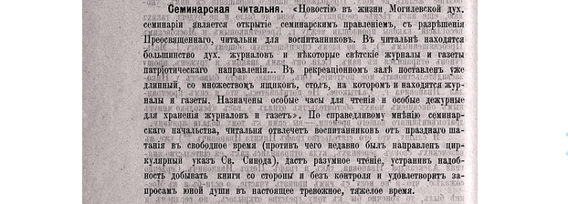 «Новостью в жизни Могилевской духовной семинарии является открытие семинарским правлением, с разрешения Преосвященного, читальни для воспитанников. В читальне находится большинство духовных журналов и некоторые светские журналы и газеты патриотического направления… В рекреационном зале поставлен уже длинный, со множеством ящиков стол, на котором и находятся журналы и газеты. Назначены особые часы для чтения и особые дежурные для хранения журналов и газет. По справедливому мнению семинарского начальства, читальня отвлечет воспитанников от праздного шатания в свободное время, даст разумное чтение, устранив надобность добывать книги со стороны и без контроля и удовлетворит запросам юной души в наше тревожное, тяжелое время».