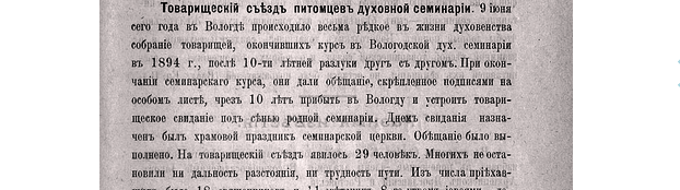 «9 июня 1904 года в Вологде происходило весьма редкое в жизни духовенства собрание товарищей, окончивших курс в Вологодской духовной семинарии в 1894 году, после десятилетней разлуки друг с другом. По окончании семинарского курса они дали обещание, скрепленное подписями на особом листе, прибыть в Вологду и устроить товарищеское свидание под сенью родной семинарии. Днем свидания был назначен храмовый праздник семинарской церкви. Обещание было выполнено. На товарищеский съезд явилось 29 человек, многих не остановили ни дальность расстояния, ни трудность пути. Из числа приехавших было 18 священников и 11 светских…