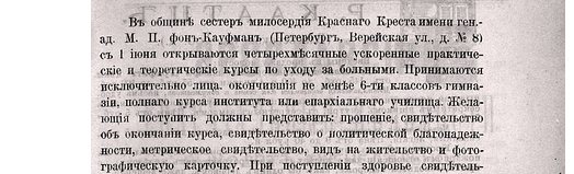«В общине сестер милосердия Красного Креста… открываются четырехмесячные ускоренные практические и теоретические курсы по уходу за больными. Принимаются исключительно лица, окончившие не менее шести классов гимназии, полный курс института или епархиального училища… От общины полагается полное содержание, форменное обмундирование и постельное белье. При отправлении на войну все форменное обмундирование делается за счет общины и ежемесячно выдается по десять рублей на мелкие расходы при готовом содержании. Поступившие должны подчиняться всем правилам общины».