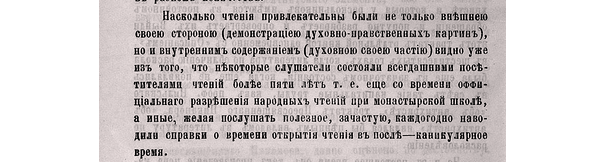 Насколько чтения были привлекательны не только внешней своей стороной (демонстрацией духовно-нравственных картин), но и внутренним содержанием (духовной своей частью), видно уже из того, что некоторые слушатели состояли всегдашними посетителями чтений более пяти лет… И так во все время чтений почти всегда школьное помещение было полно народа, искавшего здесь духовно-нравственной услады, назидания и утешения.