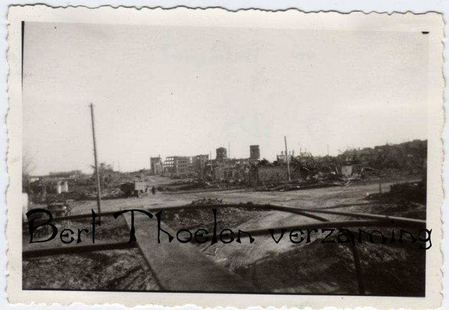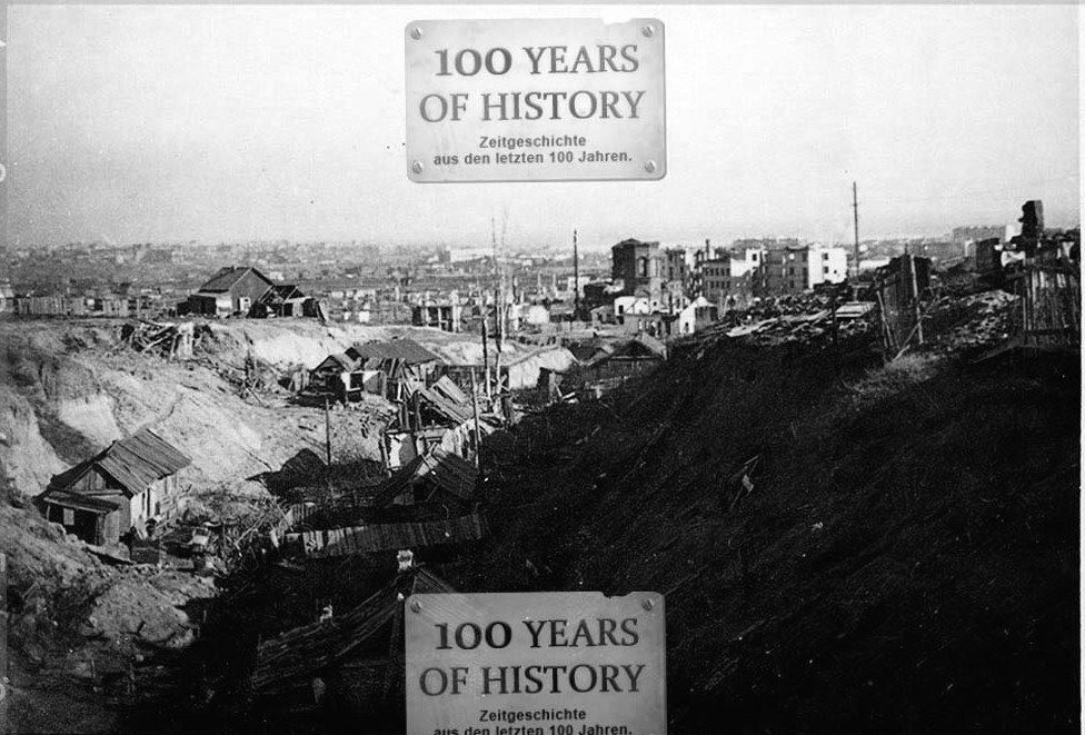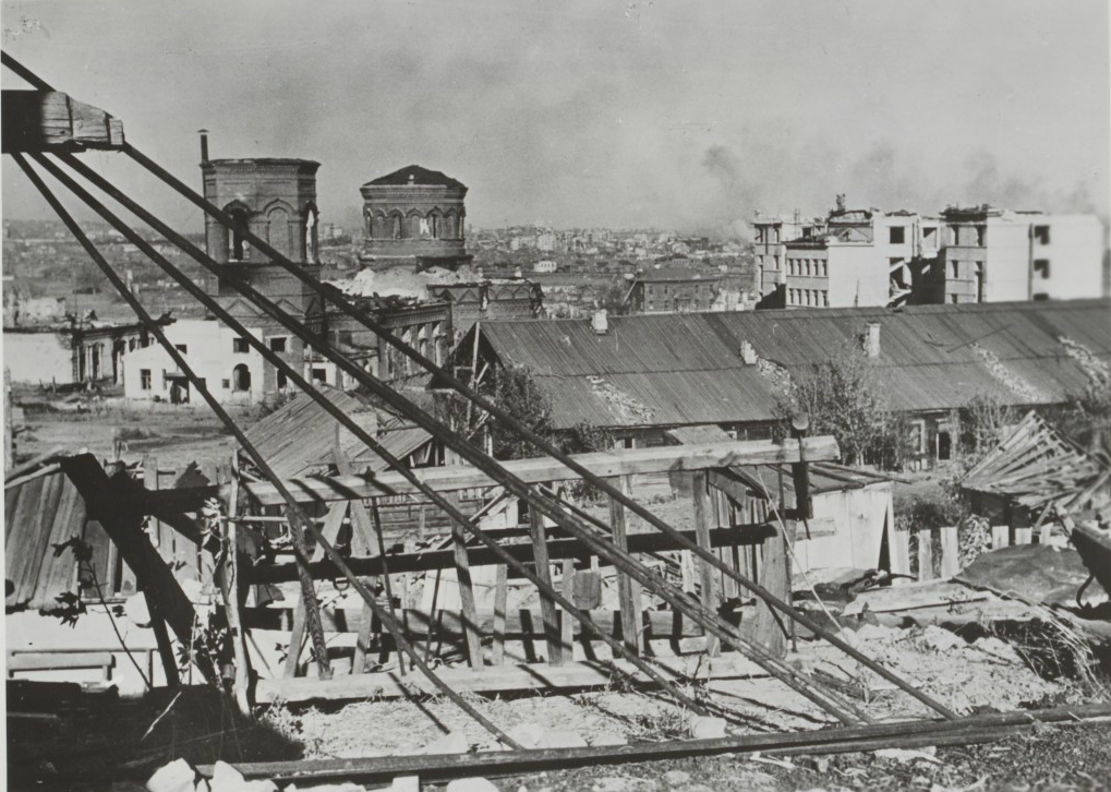 Вот на немецкой фотографии вдалеке видны остатки Казанского собора. Обратите внимание, как сильно пострадал город от разрывов бомб и снарядов, страшных пожаров.