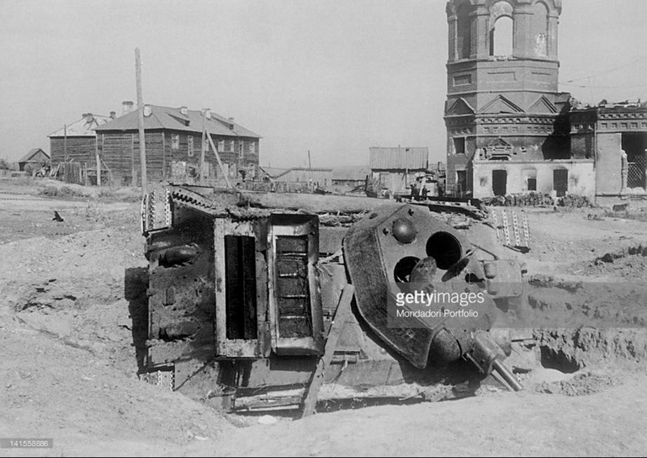 Но, когда враг ворвался в город, стало еще хуже. Разгорелись ожесточенные уличные бои, о накале которых можно судить по фотографии от 1 сентября 1942 г., на которой возле Казанского храма в окопе лежит наш перевернутый танк Т-34.