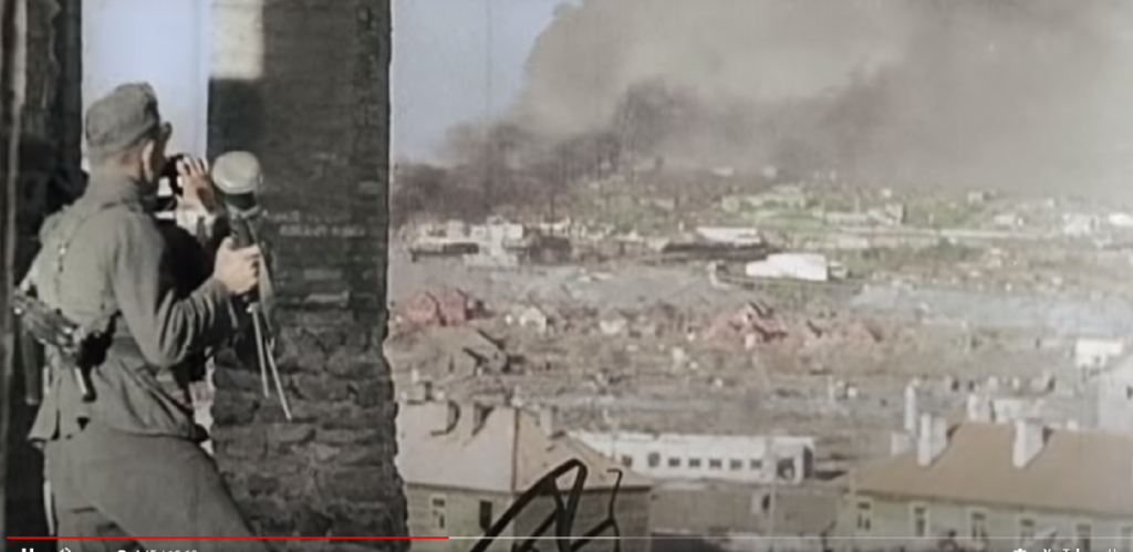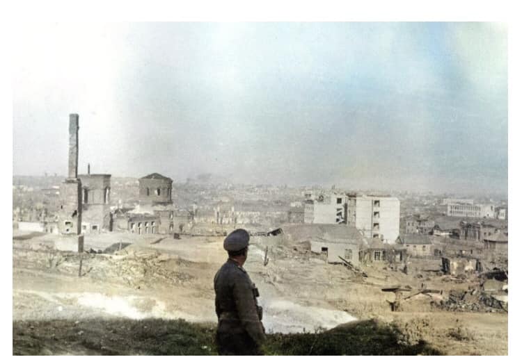 Это раскрашенный кадр из вражеской кинохроники за сентябрь 1942 г. Некоторые кадры трофейной кинохроники о «взятии» города фашистами были вставлены в 1944 г. в фильм «Возрождение Сталинграда».