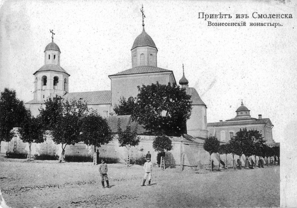 «Неприятели-французы, …взяв Смоленск, сожгли, разорили и разграбили этот монастырь почти до основания: деревянныя монастырския здания, келии инокинь и церковь Печерской Божией Матери, за разграблением их предали пламени, а в каменной соборной церкви и во всех ея приделах расхитили и обобрали совершенно все имущество и богатство, оставленное инокинями, как-то: драгоценные серебряные и золотые оклады на иконах, богатую церковную утварь и ризницу; святотатственная рука их коснулась даже дорогой верхней и нижней одежды на престолах и жертвенниках и катапетасм на царских вратах. …Возвратившись в обитель в конце того же 1812 года, игумения и некоторые престарелые инокини не нашли здесь для себя ничего, нуждались в пище и одежде, не имели приюта и принуждены были проживать в разоренных неприятелем, но наскоро несколько исправленных черных избах».
