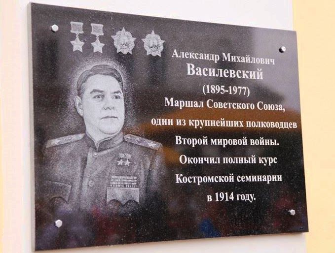 В Костроме есть великолепный бюст маршала, но с мемориальными табличками как-то не задалось. Например, на одном из корпусов университета висит мраморная доска, что, мол, здесь учился маршал Василевский. Это бывшее семинарское здание, а у читающего складывается впечатление, что он окончил госуниверситет, который начал формироваться после 1917 года, когда Василевский уже два года был офицером.