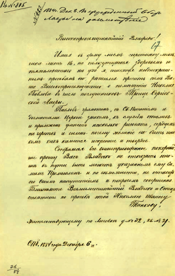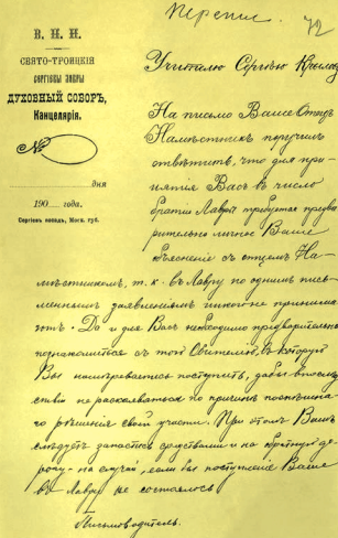 Среди писем выделяются два, на которое руководство лавры отреагировало особенно тепло. Опекун просил за шестнадцатилетнего мальчика Николая Павлова, проживавшего в Санкт-Петербурге, хорошо описывая его внутренний облик и умения. Ответ от Учрежденного собора был таков, что в монастырь заочно, по письмам, не принимают, но документ этот скорее напоминает пригласительное письмо, пространное, теплое и приветливое.