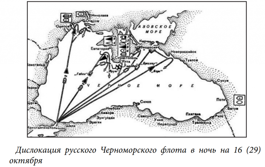 27 октября 1914 г. командование германо-турецкого флота приняло решение нанести внезапно и по возможности одновременно удары по базам и портам русского флота. Корабли разбивались на отряды. На Одессу направлялись крейсер «Меджидие», минный заградитель «Самсун» и 2 эсминца. «Пейк» должен был рвануть важный кабель Севастополь – Варна. На Севастополь нацели- 102 вались «Гебен», минный заградитель «Нилуфер» и 2 эсминца, на Южный берег Крыма – «Гамидие» с эсминцами, на Керчь и Новосибирск – «Бреслау» и «Берк». Все отряды должны были выйти к своим целям 29 октября к 6 утра и нанести удары одновременно. Атаковать все важнейшие порты. Первыми предусматривались действия против Одессы.