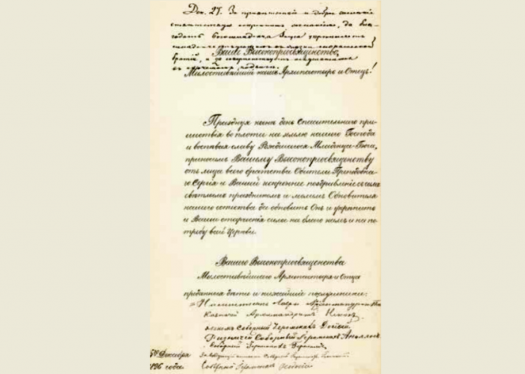 Поздравление за следующий год, которое приводится ниже, является черновиком: здесь нет подписей членов Духовного собора, и в нем не отразились делопроизводственные детали – нет вообще никаких дополнительных помет.