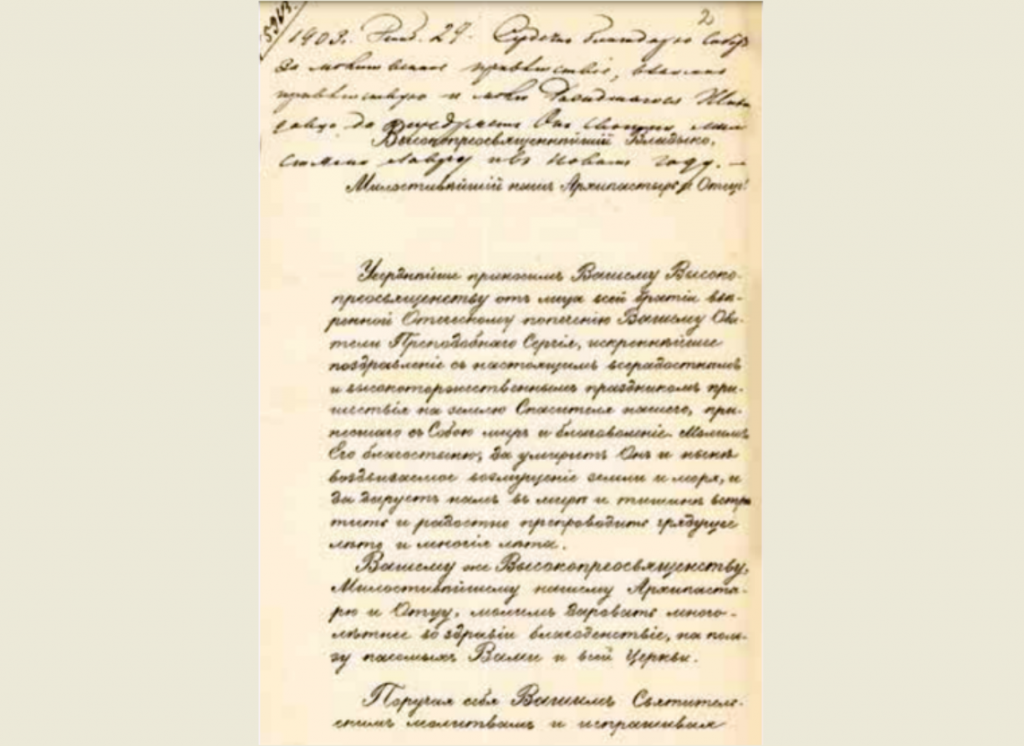 «Усерднейше приносим Вашему Преосвященству от лица всей братии вверенной отеческому попечению Вашему Обители преподобного Сергия искреннейшие поздравления с настоящим всерадостным и высокоторжественным праздником пришествия на землю Спасителя нашего, принесшего с собою мир и благоволение. Молим Его благостыню, да умирит Он и ныне воздвизаемое возмущение земли и моря, и да дарует нам в мире и тишине встретить и радостно препроводить грядущее лето и многия лета».