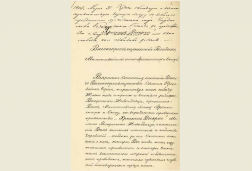 «Вверенная отеческому попечению Вашего Высокопреосвященства обитель преподобного Сергия, торжествуя ныне победу Жизни над смертью и воспевая радостно Воскресшего Жизнодавца, приносит Вам, милостивому своему Архипастырю и отцу, сие всерадостное праздничное приветствие – Христос воскресе! Молим Воскресшего Жизнодавца о ниспослании Вам великих милостей и небесных дарований, особенно за то отеческое попечение о нас, которое Вы всегда так ощутительно проявляете, и которое дает нам возможность мирного и безмятежного пребывания, наполняя чувством глубокой благодарности сердца наши…»