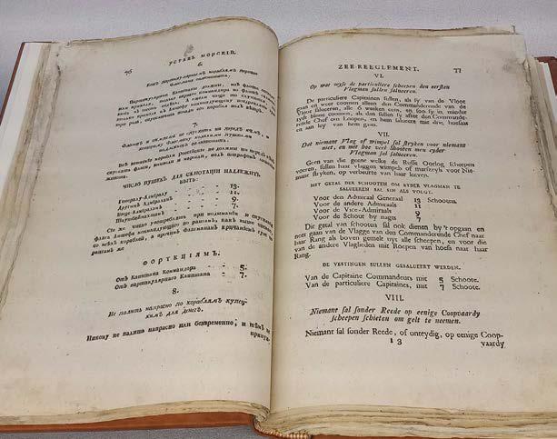 Возвращаясь к описанию устава, немаловажно отметить, что книга билингвальная – на русском и голландском языках. Это обосновано тем, что на первых этапах существования российского флота отечественных специалистов было очень мало. Командный состав на кораблях зачастую составляли иностранцы.