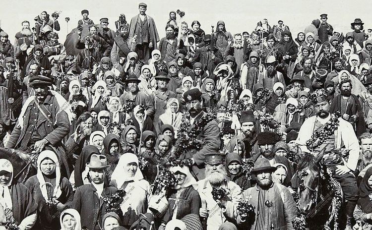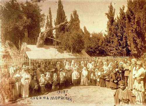 Фотографии из так называемой палестинской коллекции, которые хранятся сейчас в Государственном музее истории религии (а это около 7 тысяч фотоснимков, принадлежавших до революции Императорскому православному палестинскому обществу) сохранили для нас и образ караванов, и лица паломников, и даже то самое перечное дерево, у которого служили молебны перед отправкой каравана и на месте которого сейчас лежит асфальт. На молебне мы видим слева двух мужчин в необычных костюмах с белыми платками на шее. Это и есть кавасы, о которых пишет Дмитриевский.