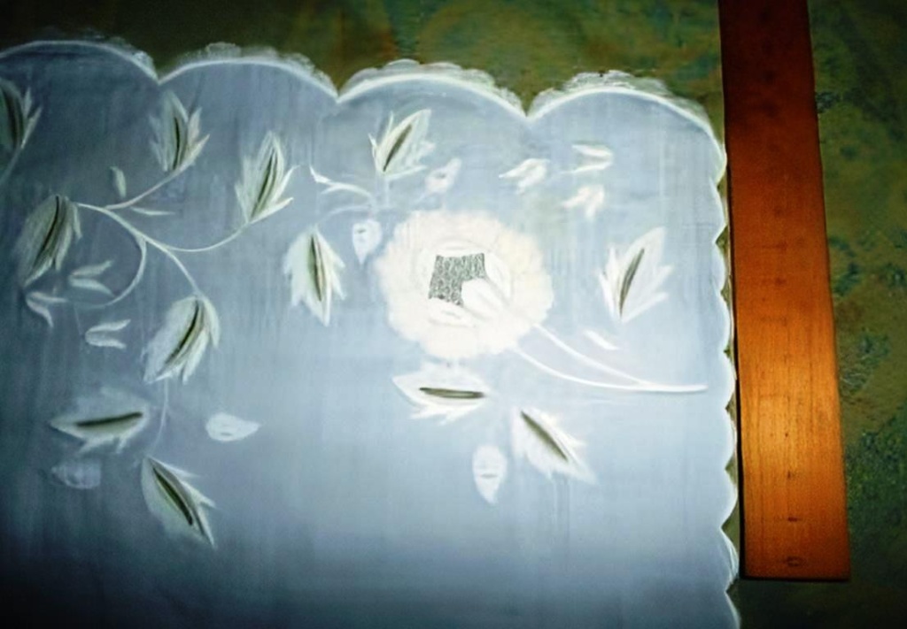 В детстве я видела старое двуспальное одеяло монастырской работы у маминой сестры. Крытое плотным матовым ярко-синим шелком, до стежки оно было вышито частичной гладью белыми цветами, а затем простегано. В вышивке использовались разные несчетные швы и накладные сетки. Набито оно было расчесанной шерстью, так называемой волной, и было теплым и легким.