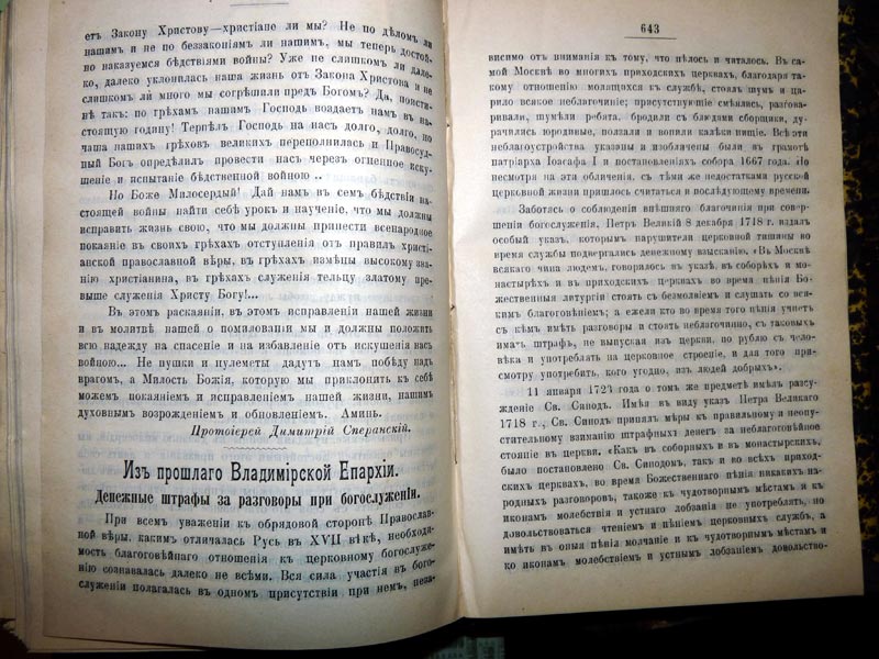 «В престольном моем граде Владимире, начав с кафедрального Успенского собора и моего дома, во всех монастырских, соборных и приходских церквах, в силу предписанного 1723 г. Святейшего Правительствующего Синода указа, учиняя с цепьми ящики, содержать внутри церкви в близости от входных дверей, дабы входящие, видя оные, в церквах от разговоров могли воздержание иметь. Если же бы кто, невзирая и на оное, по какому либо безстрашию отважился в церкви говорить, то со всех таковых, кто бы какого чину и звания ни был, по силе именного Его Императорского Величества и Святейшего Правительствующего Синода указов брать, не выпуская из церкви, поведенный штраф, который, соберя о нем обстоятельные записи, употреблять в церковное строение. Для неупускного же в церквах, чтобы никто не говорил, смотрения и говорящих ради взыскания штрафа выбрать людей достойных, а в приходских церквах старост, и о неупускном того исполнении как тех нарочно поставленных людей, так и самих священноцерковнослужителей обязать крепкими подписками и о всем вышеписанном для надлежащего всякому ведома и исполнения, сочиняя в консистории и пописав формуляр, выставить с оного при всех церквах публичные листы. А чтобы и во всей епархии таковое исполнение происходило неупускно, о том, куда надлежит, послать из консистории указы и при них разослать по одному листу»,