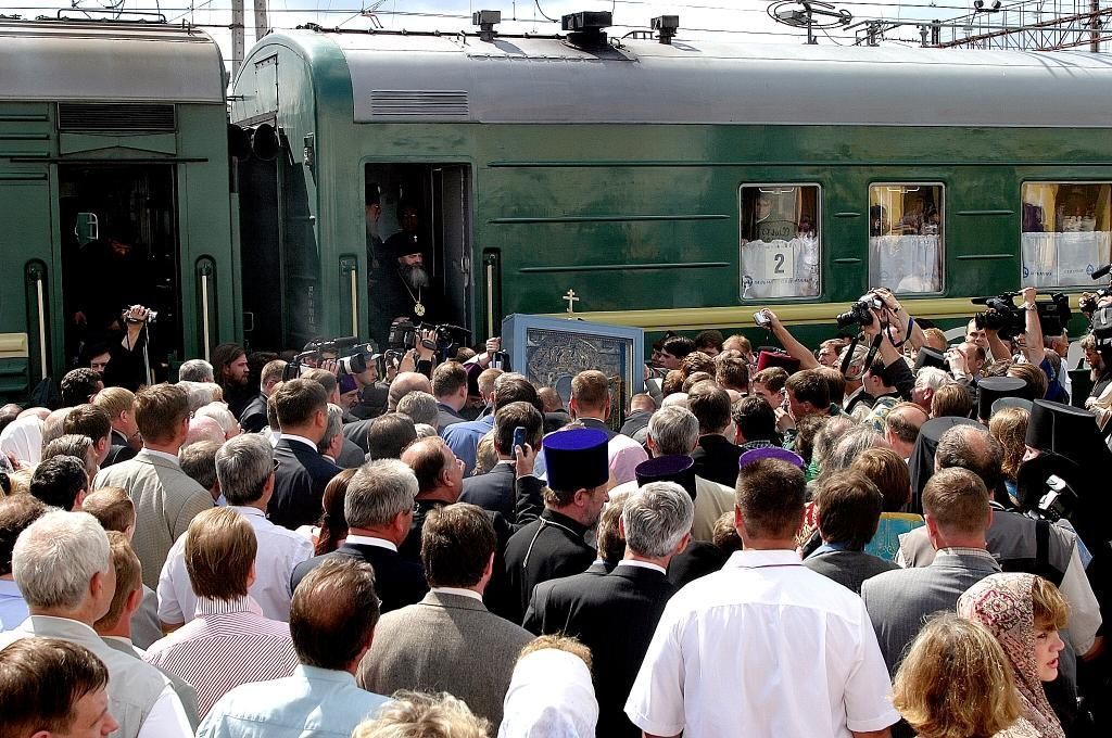 Тысячи людей стали стекаться на привокзальную площадь задолго до прибытия специального поезда Санкт-Петербург — Тихвин. Последнюю часть своего многолетнего странствия по миру — от вокзала до Свято-Богородичного монастыря — Тихвинская икона Божией Матери проделала по дороге, усыпанной живыми цветами, в сопровождении сонма православного духовенства и многотысячного народа Божия.