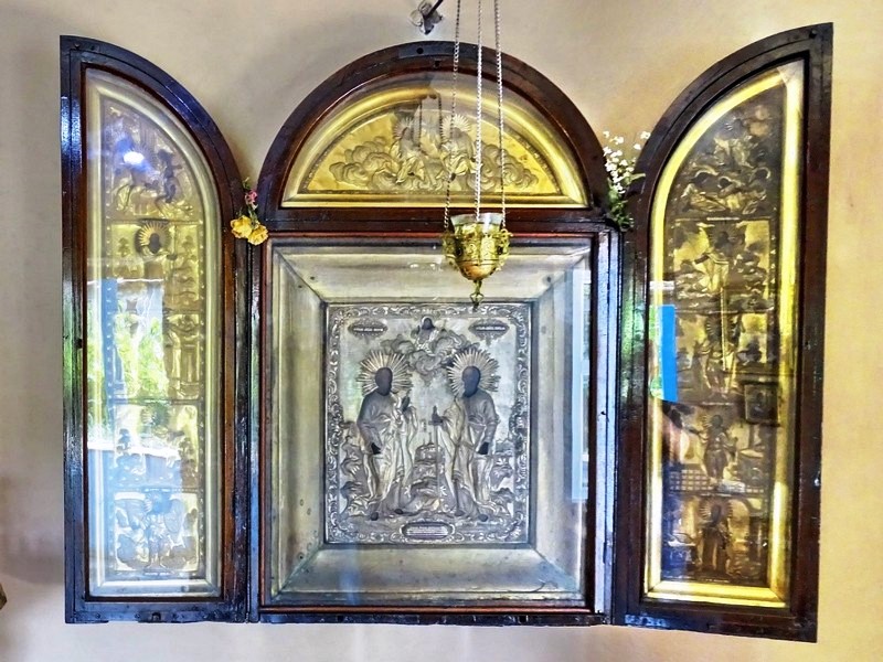 Образы святых апостолов Петра и Павла были выбраны покровителями полка. На боковых створках иконы изображены: на левой створке – святой Иоанн Предтеча, святитель Николай Чудотворец, апостол Иаков Алфеев, Архистратиг Божий Михаил, на правой створке – апостол Андрей Первозванный, святой князь Александр Невский, великомученик Георгий Победоносец и преподобный Исаакий Далматский.
