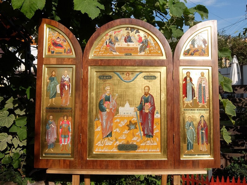 Создать точную копию иконы оказалось делом достаточно трудным и дорогостоящим, так как подлинник иконы и все образы, сопутствующие центральному образу святых апостолов Петра и Павла, обрамлены в серебряные оклады, воссоздать которые в наше время и нашими силами оказалось практически невозможно. Решили создать не копию иконы, а ее реплику (список), которая бы имела изобразительное и смысловое сходство с оригиналом.