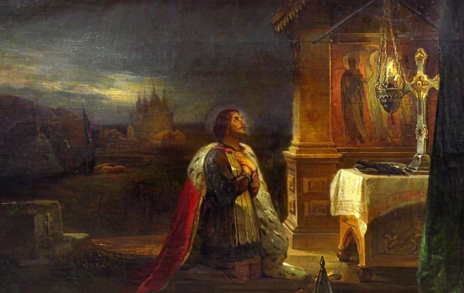 Мы видим князя перед битвой на Чудском озере в Троицкой церкви, перед образом Святой Троицы и мощами благоверного князя Всеволода. Он молится, «падъ на землю предъ образомъ святыя Троица, и помолися на долгъ часъ со слезами». Князь испытывает волнение перед сражением, но укрепляет себя молитвой в храме. Он как человек православной веры просит о помощи Божией.