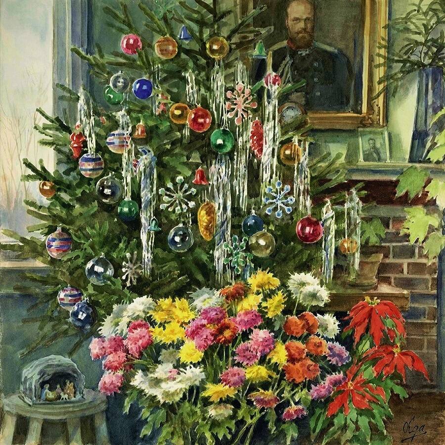 «Рождество Христово с портретом Александра III» она написала в 1950 году, за десять лет до смерти. Теплая и уютная картина стала воплощением светлой грусти и ностальгии Ольги Александровны по родине, утраченной ею навсегда.
