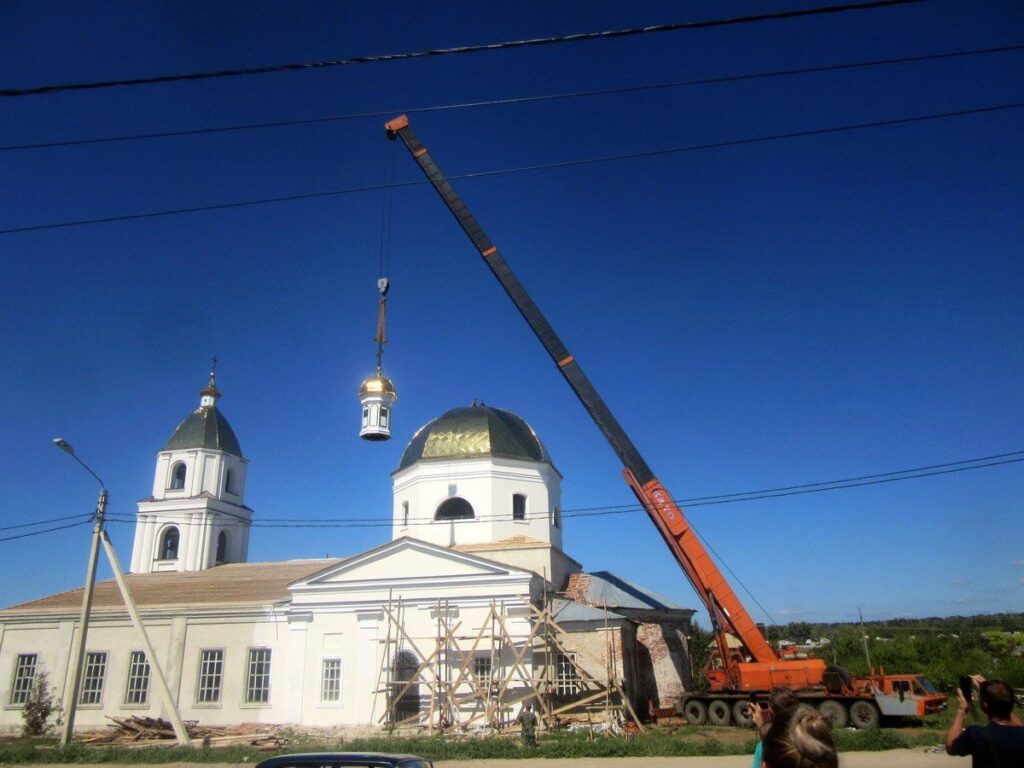 Купол был изготовлен и освящен весной этого года, однако чтобы поднять его на 18-метровую высоту, требовался автокран грузоподъемностью 100-150 тонн. После долгих и безрезультатных поисков подходящей техники купол было решено установить с помощью двух автокранов грузоподъемностью 60 и 80 тонн. Это решение сработало, купол был благополучно установлен на здание церкви.