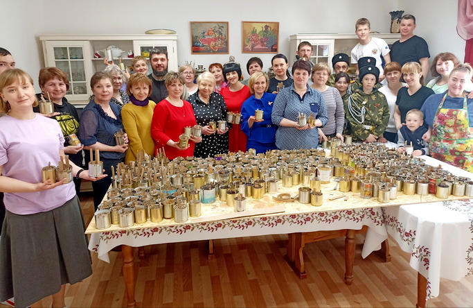 Люди в свой выходной день трудились более пяти часов, чтобы помочь фронту. Консервные банки, парафин, свечи и картонные коробки для этого они собирали несколько месяцев, сообщает сайт Югорской епархии.