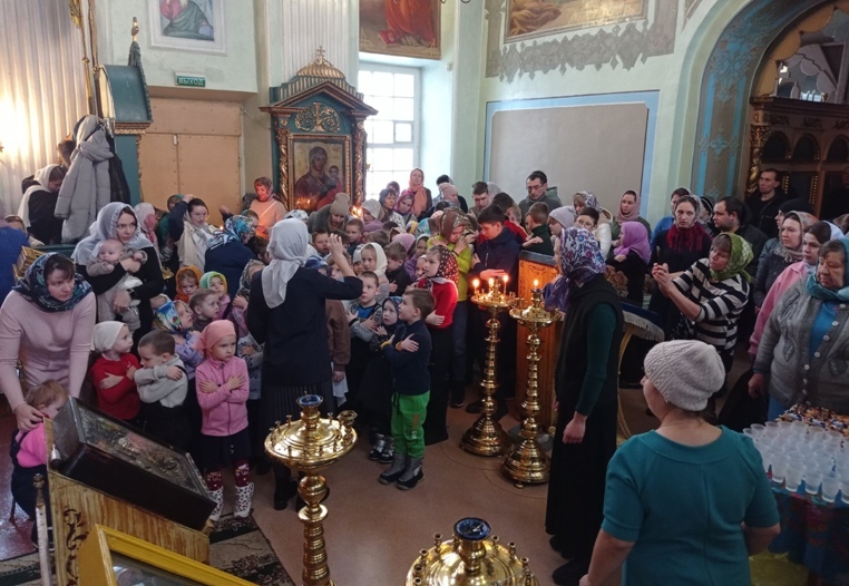 В связи с тем, что среди учеников воскресной школы больше половины новичков в православной вере, их семьи только делают первые шаги на пути к Богу, на службе были предусмотрены такие вспомогательно-поясняющие моменты, как служба с открытыми Царскими вратами; чтение отрывков из Библии, Апостола и Евангелия, на русском языке.