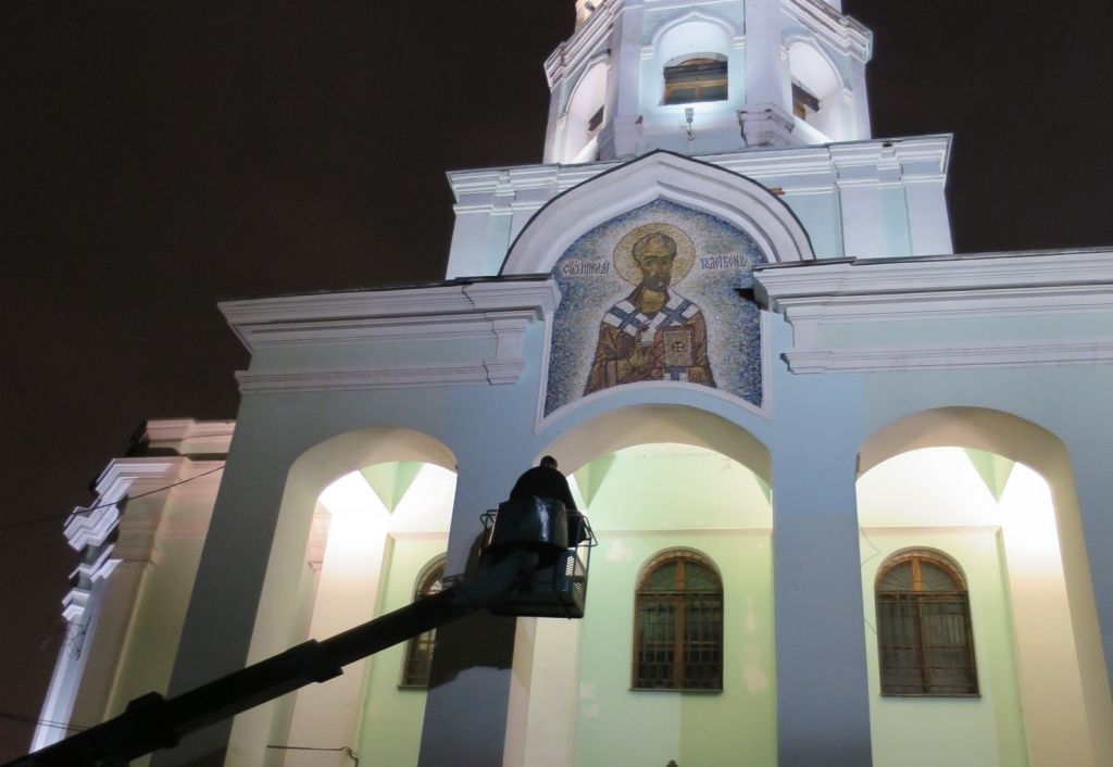 Как сообщили порталу «Приходы» в клубе, вечером 6 декабря праздник десятилетия «АРТ’ЭРИи» начался освящением иконы святителя Николая Чудотворца над входом в Никольский храм на Трех горах; мозаичный образ работы Нины Кибрик освятил настоятель прихода протоиерей Всеволод Чаплин. Для этого ему пришлось подняться на подъемной машине на десятиметровую высоту.