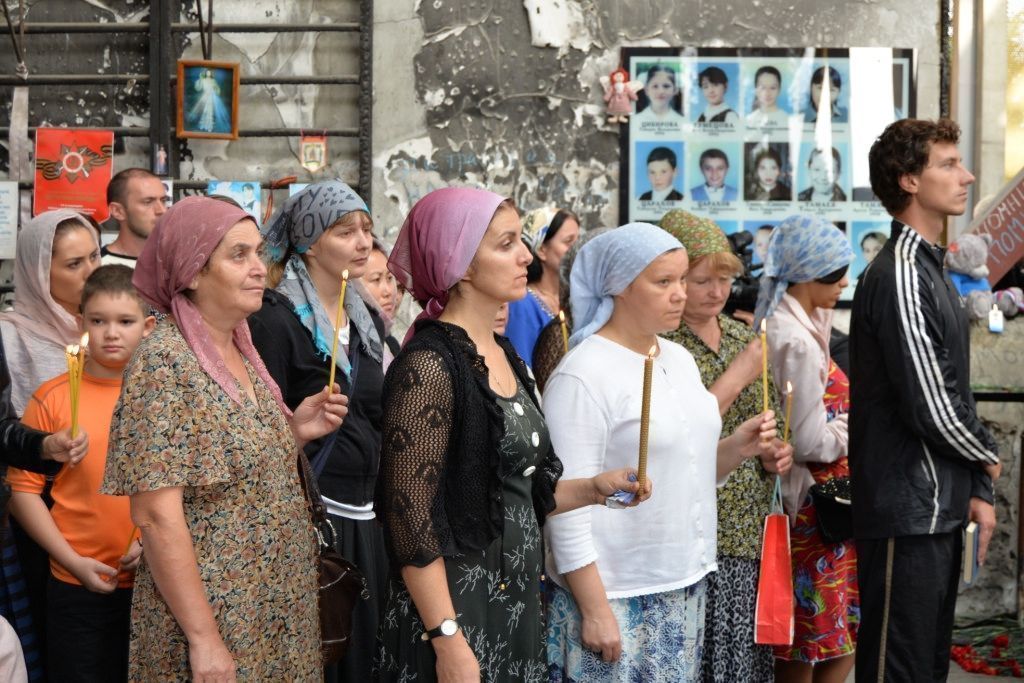 Для совместной молитвы на месте трагедии собрались жители Беслана, других городов республики, родственники погибших и бывшие заложники. Большинство присутствовавших на богослужении причастились Святых Христовых Таин.