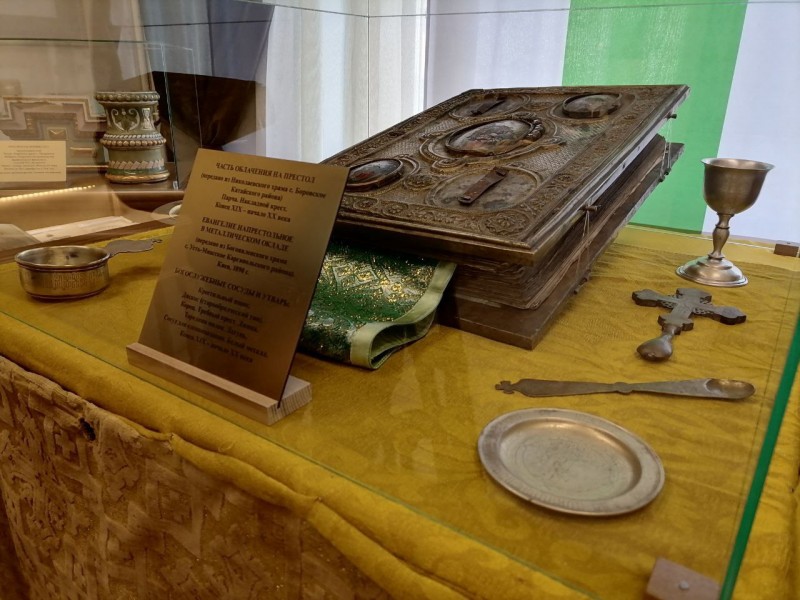 Экспозиция включает около пятисот экспонатов XIX-XXI веков. Среди них — богослужебные сосуды, икона Видение лествицы Иаковом, а также Евангелие в металлическом окладе XIX века и другие богослужебные книги XIX -XX веков. Все они связаны с церковной жизнью местных прихожан в разные периоды российской истории, сообщает «Курган и курганцы».