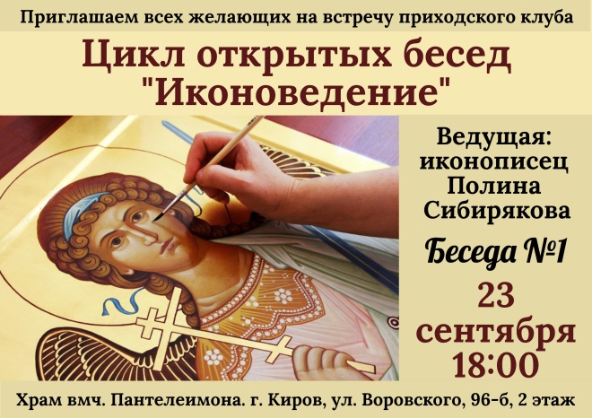 Приходы.ру 20.09.2022. В конце текущей недели при храме великомученика Пантелеимона в Кирове стартует курс бесед по иконоведению. Посещать занятия приглашают прихожан Вятской епархии и всех желающих.