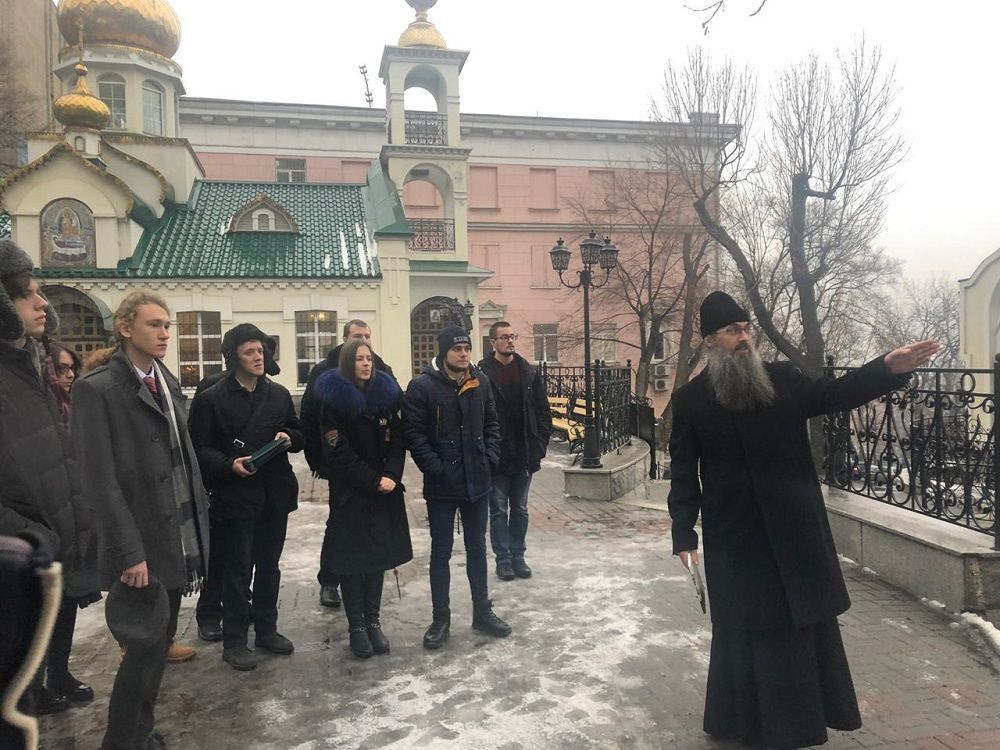 Экскурсию по Успенскому храму для студентов провел настоятель — епископ Уссурийский Иннокентий, доцент кафедры теологии. Гости узнали не только об истории Успенского собора, его святынях и первых православных жителях Владивостока, но и познакомились с современностью прихода: социальной, молодежной, образовательной деятельностью. В конце встречи владыка пригласил студентов на чаепитие в приходскую трапезную, где общение продолжилось в формате вопрос-ответ, сообщает сайт Владивостокской епархии.