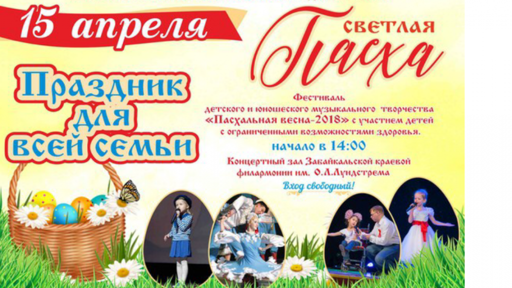 «С радостью приглашаем 15 апреля на семейный праздник в краевую филармонию! Давайте поддержим юных артистов — детей с ограниченными возможностями!» — сообщает портал «Православное Забайкалье».