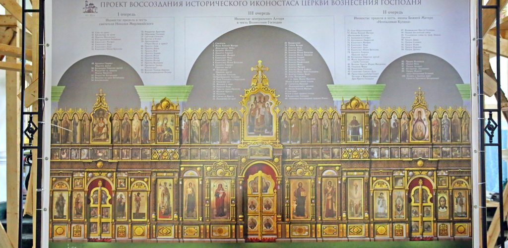 Из 112 икон центрального иконостаса готовы пока 18 для Никольского придела. В основу проекта исторического иконостаса Вознесенской церкви легла старинная фотография — единственный документ, рассказывающий об интерьере храма. Благодаря еще одной счастливой находке — старинному стеклянному негативу этого снимка — удалось рассмотреть с высокой степенью детализации все сюжеты икон центрального иконостаса и детали его резьбы.