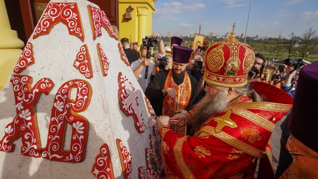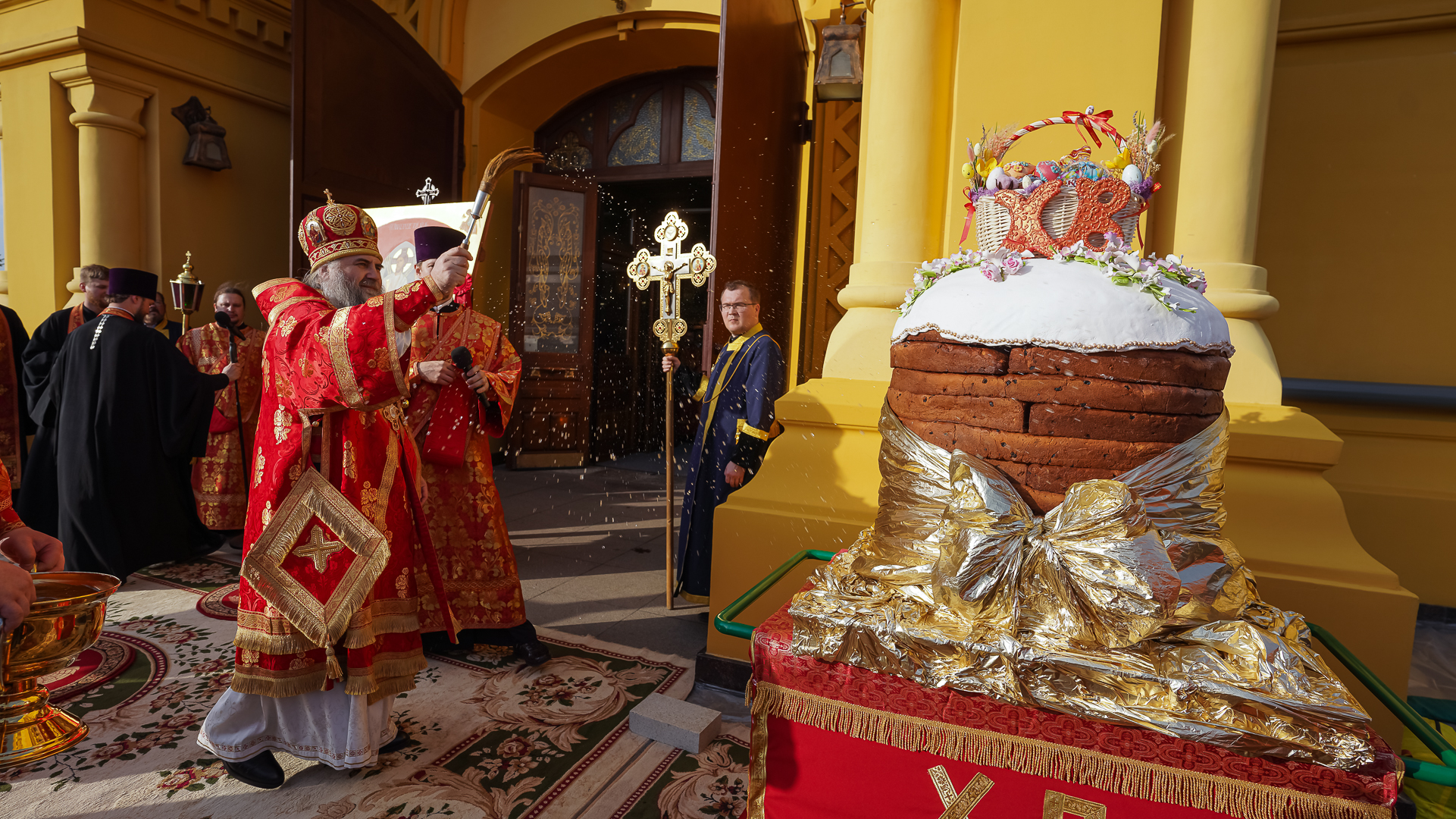 Приходы.ру 23.04.2025. 20 апреля, в день Светлого Христова Воскресения, у стен Александро-Невского кафедрального собора Нижнего Новгорода митрополит Нижегородский и Арзамасский Георгий освятил царь-пасху и гигантский кулич.