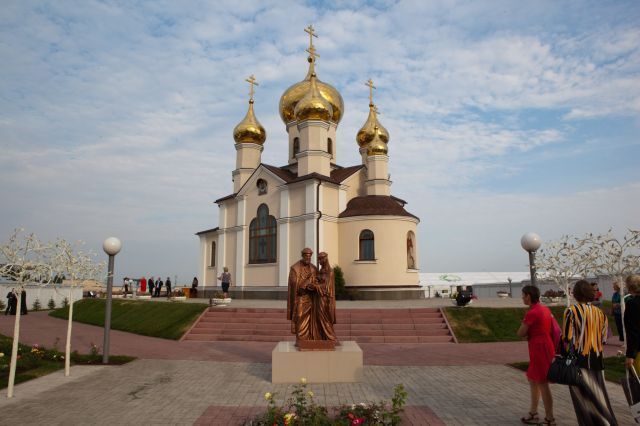 Перед церковью на небольшом постаменте установлено скульптурное изображение святых Петра и Февронии Муромских. По завершении литургии архипастырь освятил памятник небесным покровителям христианской семьи.