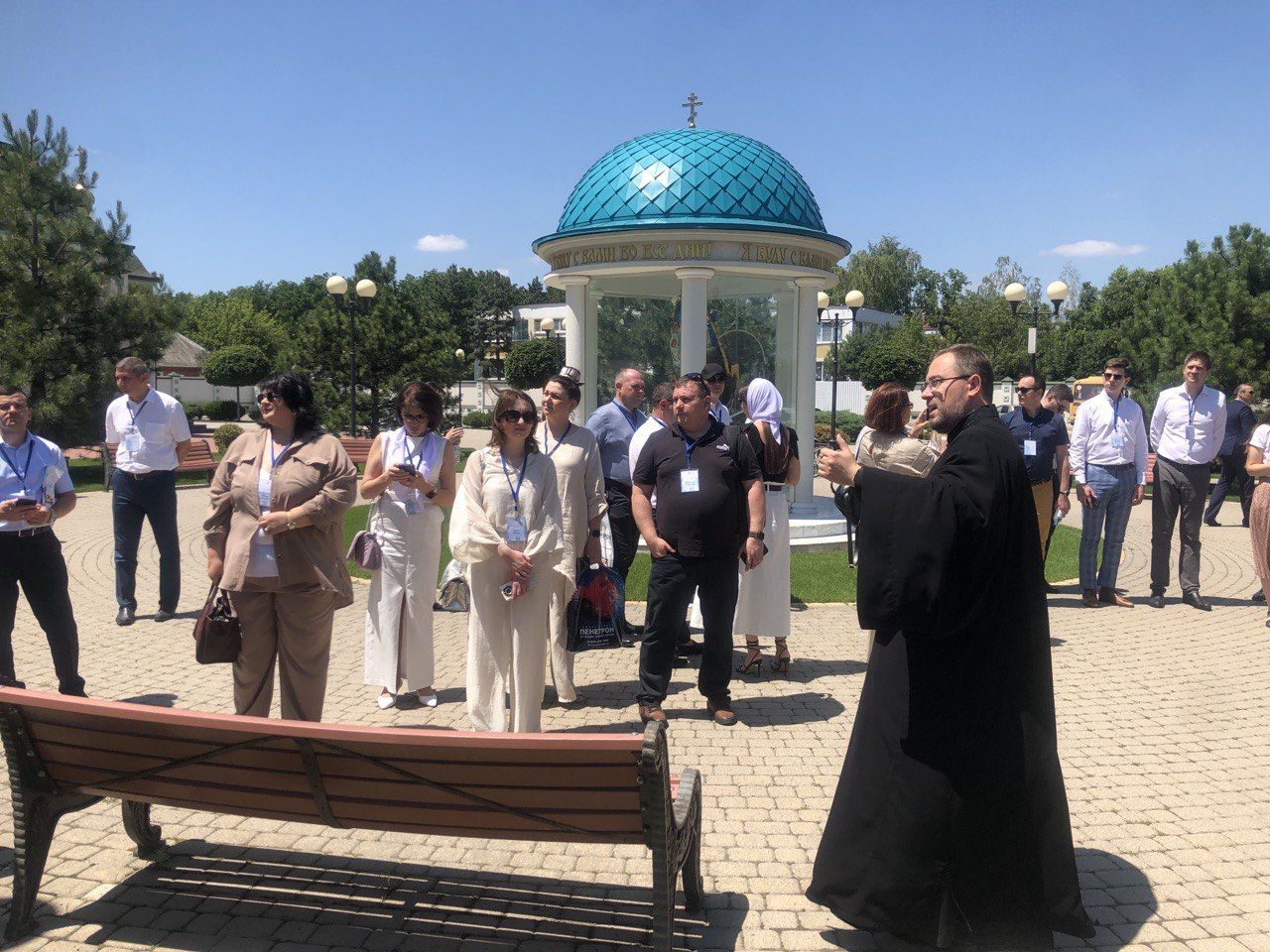 Гостей встретил штатный клирик храма диакон Георгий Белан. Он провёл экскурсию по территории, рассказал об истории храма и его святынях, а также показал объекты, пользующиеся особым вниманием прихожан и паломников: купель для совершения таинства крещения, образ горы Фавор, символизирующий место Преображения Господня, икону Божией Матери «Киккская», одну из главных святынь храма. Архитекторы побывали также на святом источнике.