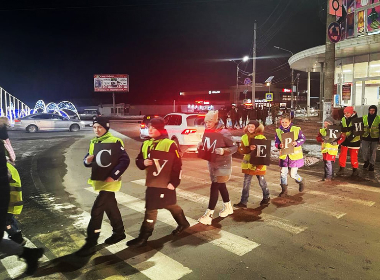 Приходы.ру 09.12.2022. Воспитанники воскресной школы Богоявленского кафедрального собора г. Клинцы Брянской области вместе с сотрудниками Госавтоинспекции в начале декабря провели акцию «Сумерки». Дети вышли с автоинспекторами на центральные улицы города, чтобы продемонстрировать участникам дорожного движения эффективность использования световозвращающих элементов на одежде в темное время суток.