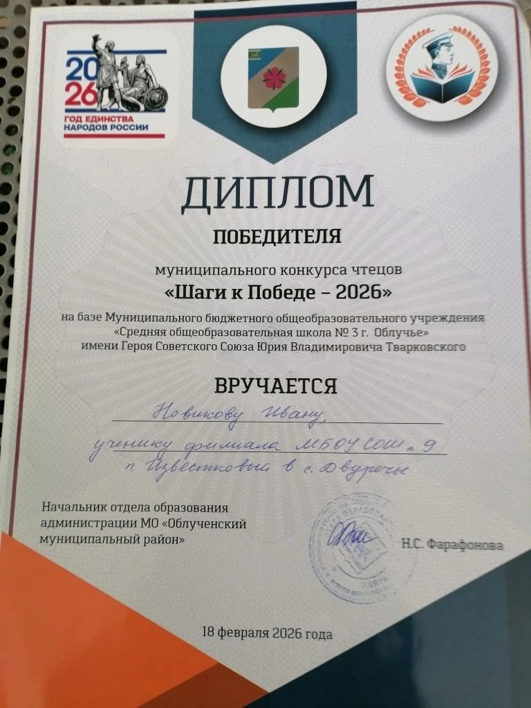 Приходы.ру 26.02.2026. Муниципальный конкурс чтецов «Шаги к Победе», 21 февраля 2026 года прошел на базе средней общеобразовательной школы города Облучье (Еврейская автономная область). Конкурс проходит уже третий раз. В этом году его темой выбрали «Подвиг учителя, наставника в годы Великой Отечественной войны».
