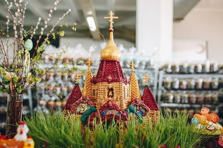 Это не копия конкретного храма, а собирательный образ деревянного зодчества Руси. В честь празднования Пасхи кондитеры подарили свое произведение магнитогорскому кафедральному собору Вознесения Христова.
