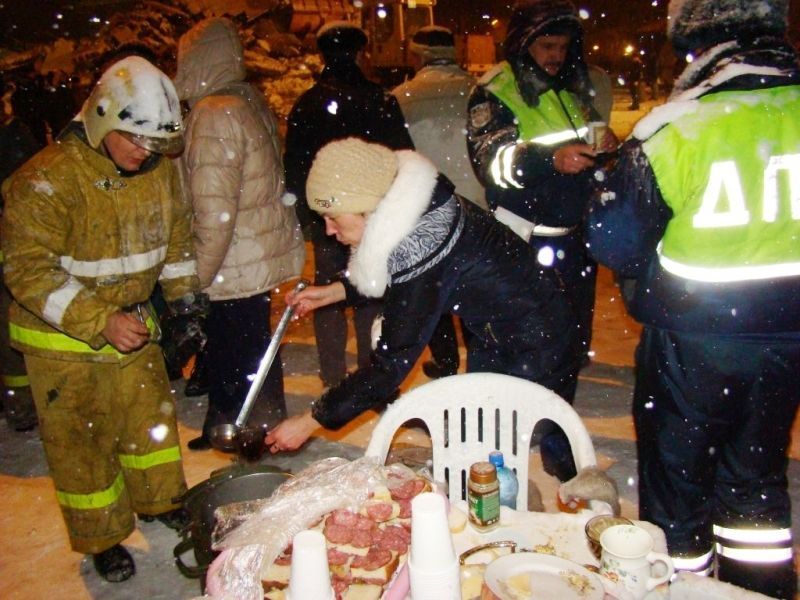 Для спасателей и работников штаба был организован пункт питания. Сестры милосердия и волонтеры группами по десять человек, сменяя друг друга каждые три часа, непрерывно готовят чай, бутерброды, горячее питание, а также оказывают необходимое содействие в использовании имеющихся в Центре семьи и молодежи средств коммуникации. Координацию работы сестер милосердия и волонтеров в течение всего времени, пока длятся поисковые работы и разбор завалов, обеспечивают священники Таганрогского благочиния.