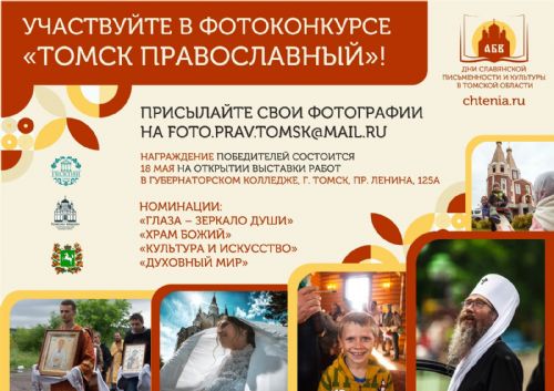 Среди заявленных номинаций: портрет «Глаза — зеркало души», архитектурная и пейзажная фотография «Храм Божий», серия фото «Томск православный» и натюрморт «Духовный мир». Работы необходимо прислать в электронном виде по адресу foto.prav.tomsk@mail.ru до 12 мая.