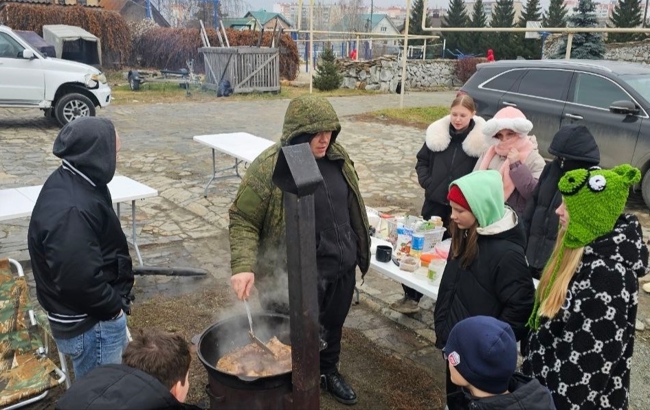 Приходы.ру 26.11.2025. Под руководством настоятеля Преображенского храма в городе Чебаркуле Челябинской области протоиерея Димитрия Егорова юноши и девушки из объединения «Фавор» приготовили настоящий узбекский плов в казане.