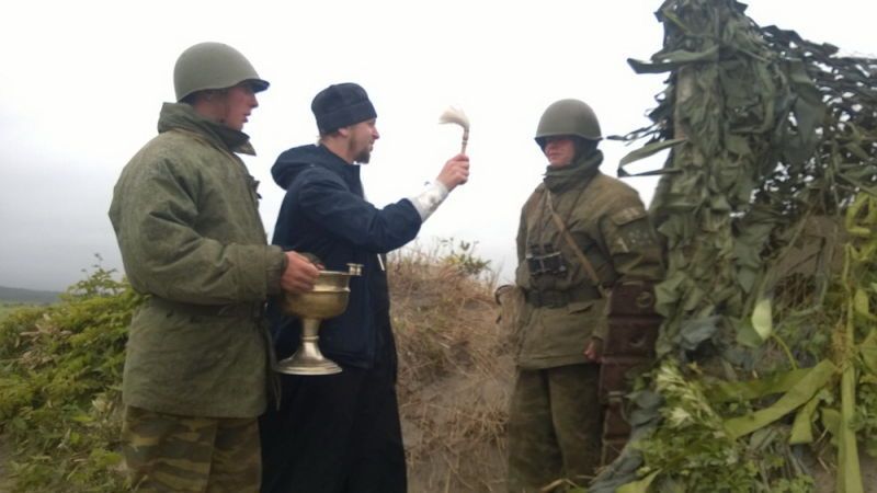 На этот раз встреча была запланирована на боевых постах, сообщил 13 июля сайт Южно-Сахалинской епархии. По согласованию с командованием полка отец Александр прибыл туда, где солдаты срочной службы проходят подготовку. Батюшка окропил святой водой боевые посты, окопы и палатки, в которых живут солдаты.